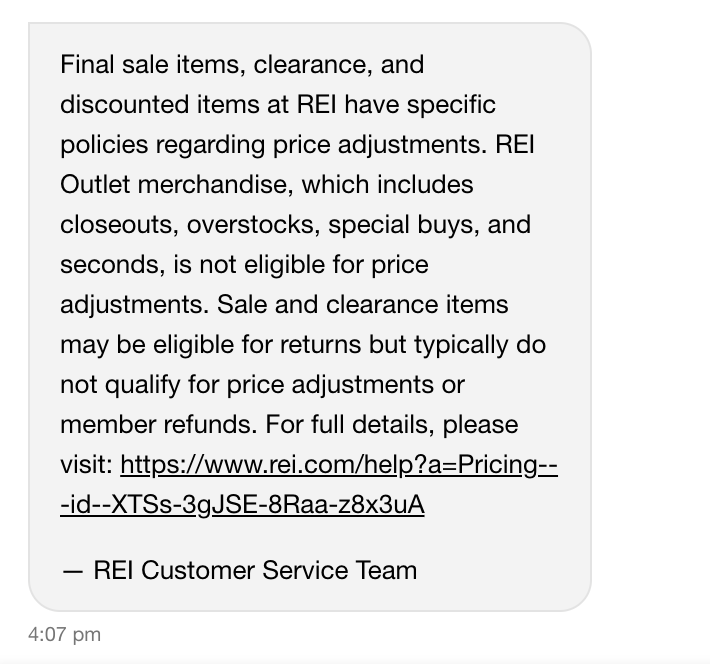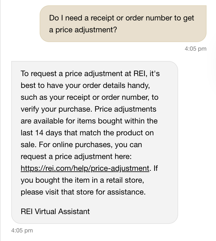 Tip: Retailers can change their price adjustment policies at any time, so it's best to check REI’s website for the latest information before making any future requests.