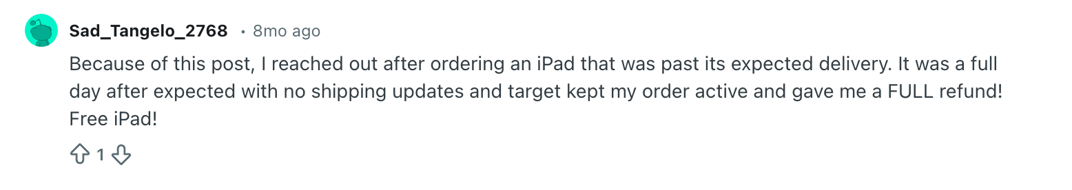 On the flip side, some customers reported finding little to no help resolving the late-delivery issue. They shared that they didn’t receive any compensation even after contacting Target about their late delivery.